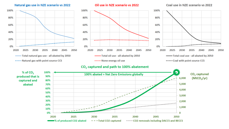 One key insight from the IEA World Energy Outlook for 2023 is that achieving net zero emissions by 2050, as per the Net Zero Emissions by 2050 (NZE) Scenario, does not require the complete phase-out of fossil fuels. Instead, it emphasizes the necessity of abating all net emissions from fossil fuels, primarily through carbon capture and storage (CCS) and other engineered carbon dioxide removals (CDR) methods, including Direct Air Carbon Capture and Storage (DACCS) and Biomass Energy with Carbon Capture and Storage (BECCS). This approach allows for the continued, albeit reduced, use of abated fossil fuels, contrasting with the more stringent demands for a complete phase-out of all fossil fuel production and use.